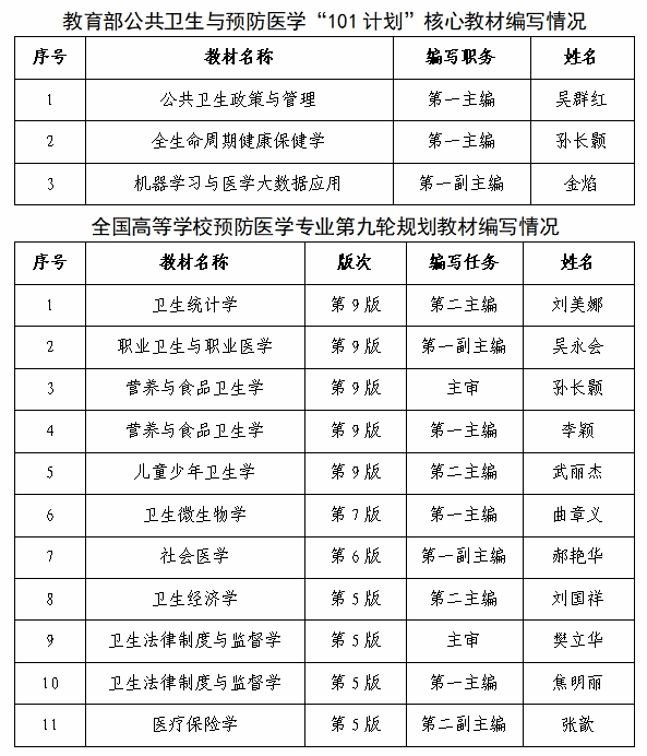 近日,教育部公共卫生与预防医学“101计划”核心教材、全国高等学校预防医学专业第九轮规划教材主编、副主编遴选结果公示结束,ac米兰有13位专家作为主审、主编或副主编参与教材编写工作。