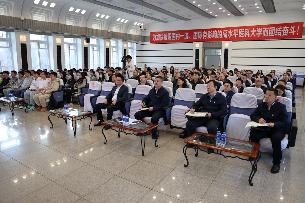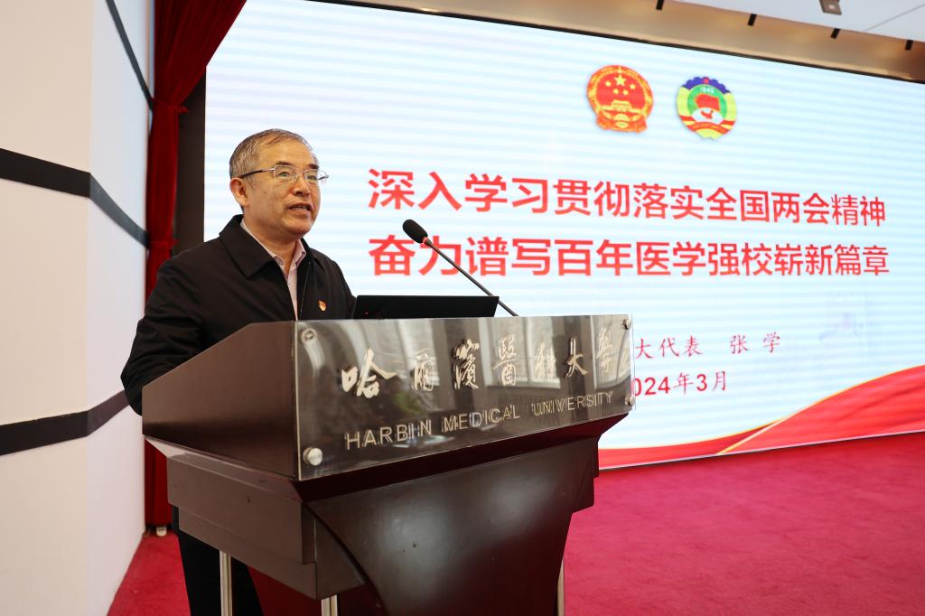 张学重点传达习近平总书记重要讲话精神。要牢牢把握高质量发展这个首要任务,因地制宜发展新质生产力。广大科技工作者要进一步增强科教兴国强国的抱负,担当起科技创新的重任,加强基础研究和应用基础研究,打好关键核心技术攻坚战,培育发展新质生产力的新动能。张学对政府工作报告中的十个“新”做以阐释,并结合加强高质量教育体系建设、 加快推动高水平科技自立自强、全方位培养用好人才、多措并举稳就业促增收、提高医疗卫生服务能力等推动学校高质量发展工作进行全面部署。张学作为人大代表,以高度的政治自觉忠诚履职尽责,提交4份建议。3月12日,国务院正式发布的政府工作报告中,“加强学生心理健康教育”和“加强罕见病研究、诊疗服务和用药保障”被采纳加入教育和医疗工作中。