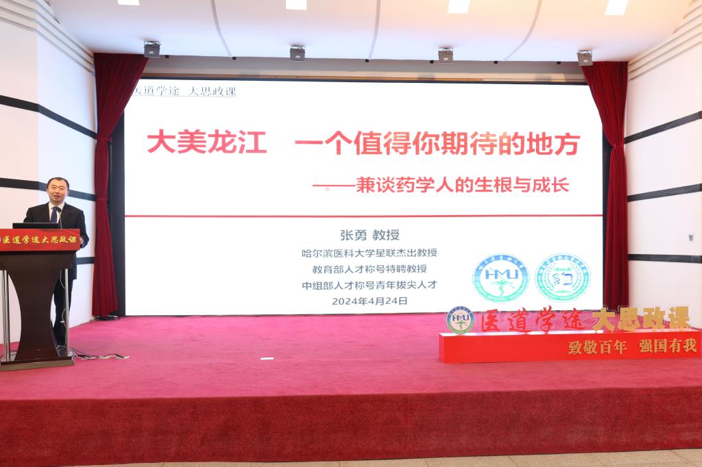 4月24日,以“致敬百年 强国有我”为主题的“医道学途 大思政课”第三场讲座在学校主楼演讲厅举办,药学院院长张勇教授以“大美龙江一个值得你期待的地方——兼谈药学人的生根与成长”为题作讲座。