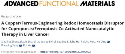 近日,ac米兰官网中文网站肿瘤医院2022级博士生张晓领在导师谢蕊教授的指导下,以第一作者在《Advanced Functional Materials》(中科院1区TOP,IF:19.0)发表题为“A Copper/Ferrous‐Engineering Redox Homeostasis Disruptor for Cuproptosis/Ferroptosis Co‐Activated Nanocatalytic Therapy in Liver Cancer”的论文,在肝癌多模式协同治疗研究取得新突破。