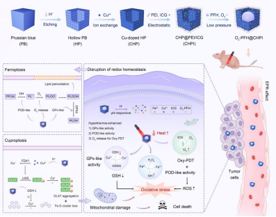 该研究构建了一种空心普鲁士蓝纳米颗粒,用于装载光敏剂吲哚菁绿和氧气饱和的液态氟碳,称为O2-PFH@CHPI纳米颗粒。在特殊的肿瘤微环境中,该纳米药物可协同催化芬顿反应,消耗内源性谷胱甘肽,引起活性氧累积。在808nm激光照射下,O2-PFH@CHPI的光热效应既可加速酶催化反应,还可触发氧气释放,促进光动力治疗,从而实现氧化应激。值得注意的是,掺杂的铜离子可以引起二氢硫辛酸转乙酰基酶(DLAT)聚集和铁硫簇蛋白质丢失,激活铜死亡。与此同时,氧化还原稳态的破坏有利于脂质过氧化和谷胱甘肽过氧化物酶GPX4失活,从而实现铁死亡。机制上,氧化应激介导的铜死亡/铁死亡可以干扰线粒体代谢,进一步破坏细胞内的氧化还原平衡,实现协同治疗效果。这项工作为利用铜/铁工程纳米酶进行铜死亡/铁死亡多模式协同治疗提供了新的指导。