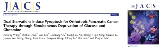 近日,ac米兰官网中文网站附属第一医院孙备教授团队与中国科学院长春应用化学研究所马平安研究员团队合作开发了一种用于双重抑制葡萄糖和谷氨酰胺摄取诱导胰腺癌细胞焦亡的纳米药物,相关成果发表于《美国化学会志》(Journal of the American Chemical Society,影响因子:15)上,并入选为当期杂志封面文章之一。