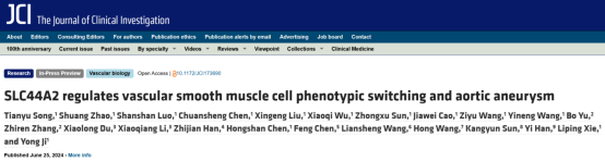 6月25日,ac米兰寒地心血管病全国重点实验室季勇教授团队首次揭示了SLC44A2(溶质载体家族44成员2)在调控血管平滑肌细胞表型转化及主动脉瘤中的关键作用和分子机制;同时,发现了药物来那度胺可调节SLC44A2的表达从而在主动脉瘤中发挥保护作用。研究论文《SLC44A2 regulates vascular smooth muscle cell phenotypic switching and aortic aneurysm》发表在《The Journal of Clinical Investigation》(IF=13.3)。