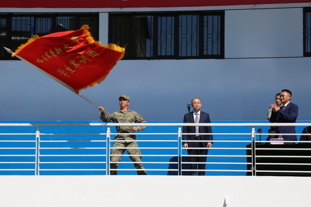 高彦辉向承担此次军训任务的中国人民解放军陆军78集团军31693部队教官代表授军训团团旗。