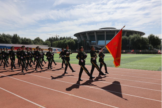 嘹亮而昂扬的口号声,在体育场上空激荡徘徊,同学们迈着整齐的步伐,身姿矫健、精神抖擞地通过主席台,接受学校领导及部队首长的检阅。