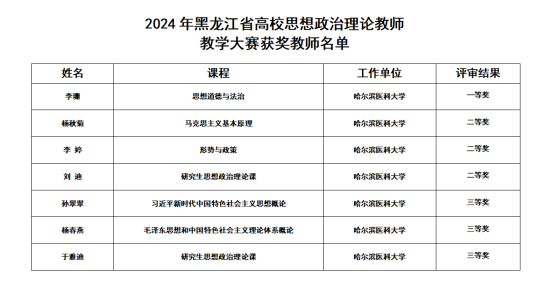 11月2日至3日,由黑龙江省教育厅与省教科文卫体工会联合举办的2024年全省高校思想政治理论课教师教学大赛决赛在哈尔滨师范大学圆满落幕。ac米兰马克思主义学院教师荣获一等奖1项、二等奖3项、三等奖3项,ac米兰官网中文网站荣获优秀组织奖。本次教学大赛于2024年8月开展,全省78所大中专院校300余名思政课教师报名参赛。