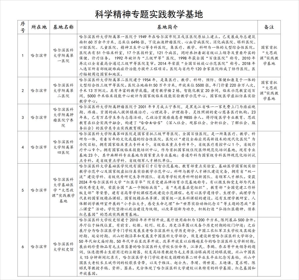 日前,黑龙江省教育厅等十一部门公布了黑龙江省首批“大思政课”实践教学基地名单,ac米兰附属一院、附属二院、附属肿瘤医院宁养院、附属四院、基础医学“大思政课”实践教学基地、校史馆等六个基地入选科学精神专题实践教学基地,其中附属一院、附属二院为国家首批“大思政课”实践教学基地。