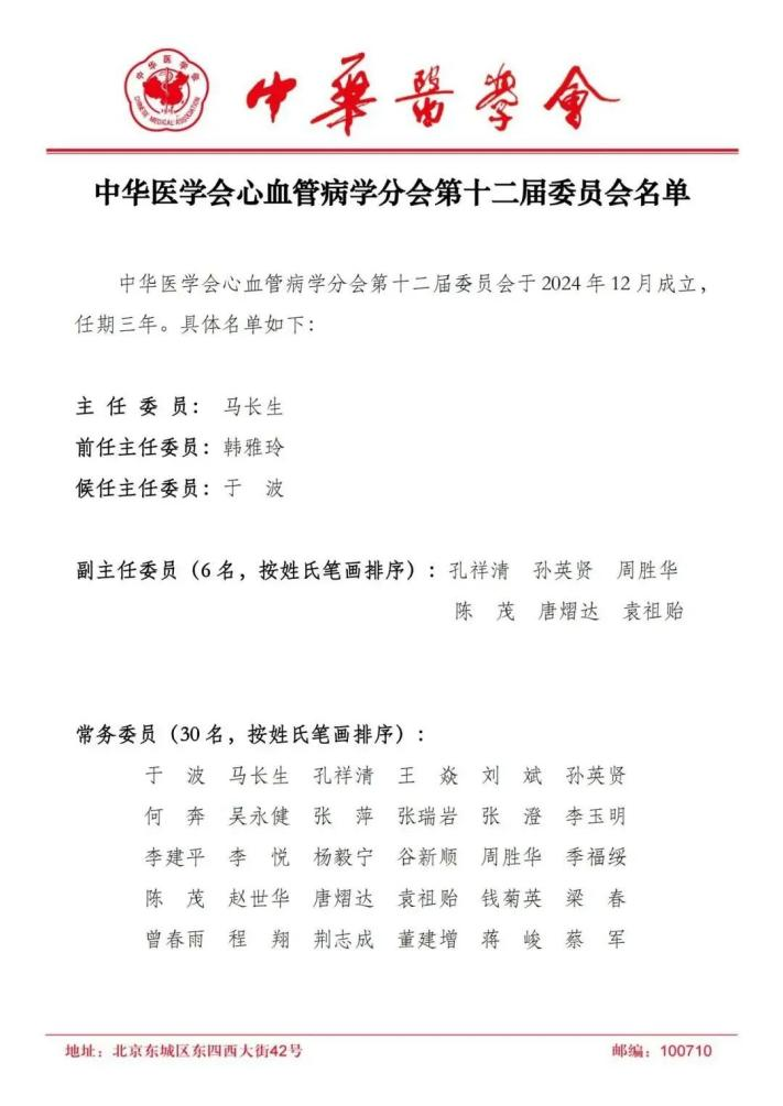 1月21日,中华医学会官网发布“中华医学会心血管病学分会第十二届委员会名单”,ac米兰官网中文网站二院心血管病医院院长、心内科主任于波教授担任中华医学会心血管病学分会候任主任委员。