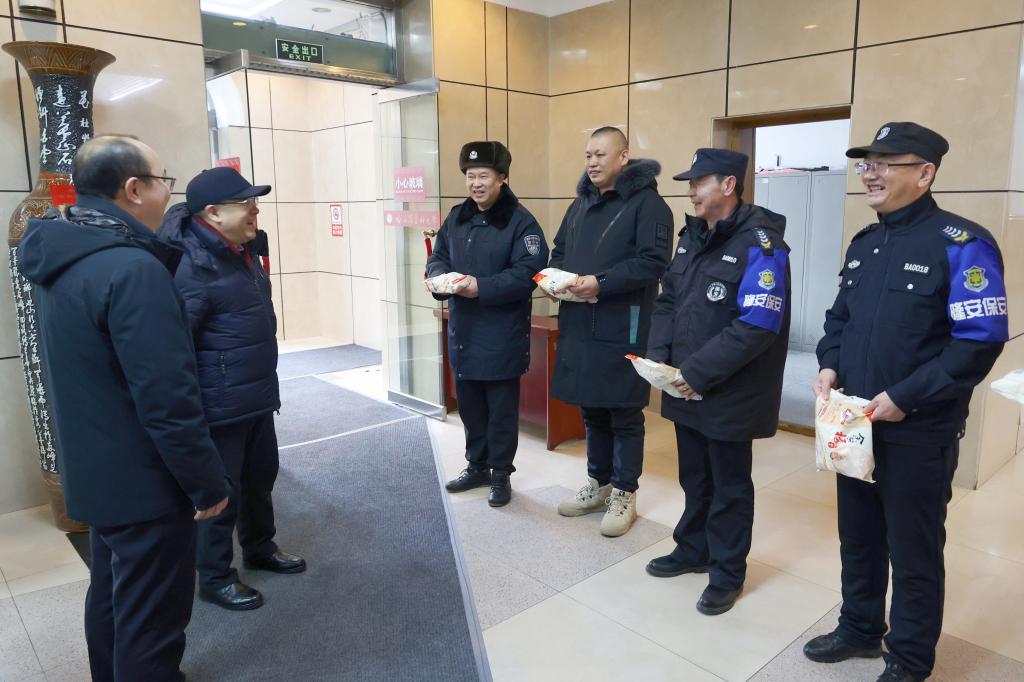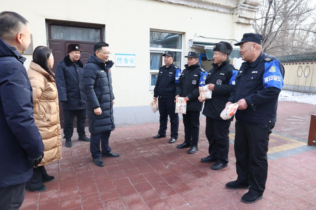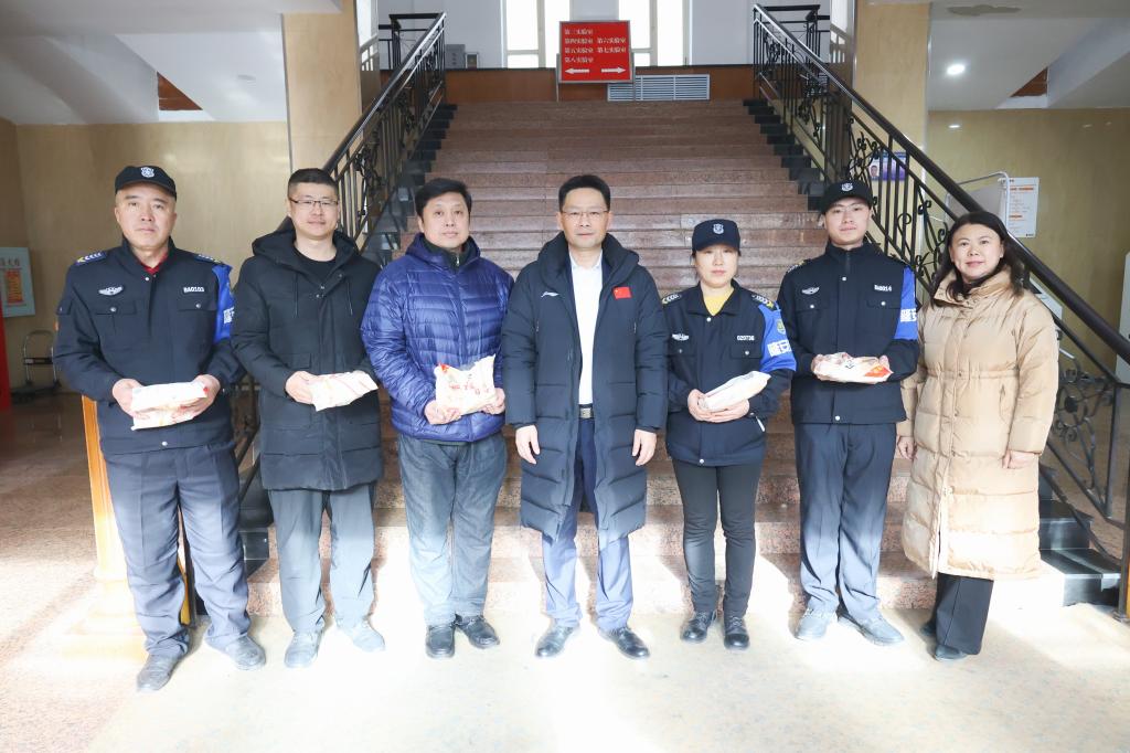 在学校主楼,张学感谢一年来门卫的辛苦付出,日夜值守,热情地送上饺子,表达亲切关怀。张学强调,门卫是保障学校安全的第一道防线,要继续发扬爱岗敬业的精神,以更加严谨的态度,守好学校的“第一关”,为学校的安全稳定保驾护航。