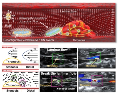 传统溶栓治疗受血流层流屏障限制,药物难以渗透至血栓核心,降低疗效并增加复栓风险。受游动细菌涡旋运动的启发,研究团队提出了一种仿生动态集群策略,利用纳米机器人系统主动打破层流屏障,提升溶栓药物的递送效率。该纳米机器人基于戊聚糖材料构建,呈烧瓶状,能够自主运动并形成类涡旋动态集群。其流体力学效应可有效突破血栓周边的层流屏障,实现精准药物递送。