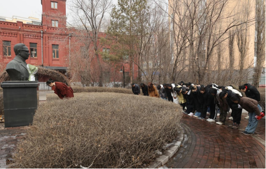 活动开始,全体师生在伍连德博士铜像前举行庄重的献花仪式。学生代表神情肃穆,缓步向前,将手中的鲜花轻轻放置在铜像前,全体肃立,向伍连德博士铜像鞠躬,表达对先驱的深切敬意。