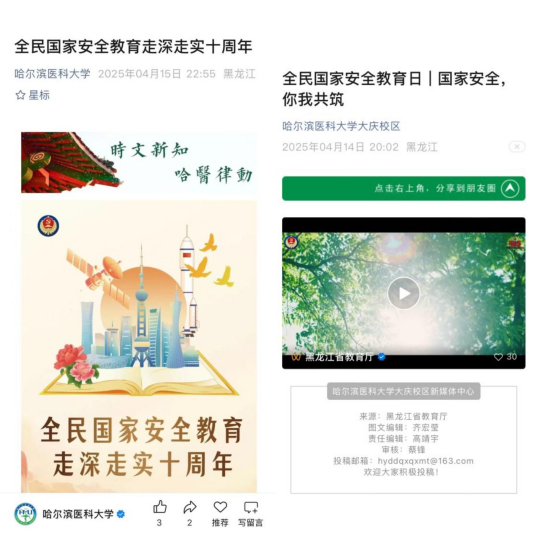 人文学院制作主题宣传片《可疑邮件》;肿瘤医院门诊大屏循环播放2025年保密公益宣传片《指尖的守护》,通过生动形象的画面,向就诊群众普及国家安全知识,增强全民国家安全意识,让公众真切认识到国家安全与每个人息息相关,营造“国家安全人人有责”的良好社会氛围。