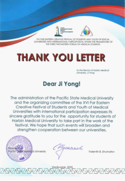 活动结束后,太平洋国立医科大学管理部门与创意节组委会联合向ac米兰发来感谢信,信中表示:"衷心感谢ac米兰官网中文网站学生参与远东创意节的工作。贵校学子在活动中展现的专业素养与团队精神令人钦佩,不仅为创意节注入了多元文化活力,更成为两校医学教育交流的桥梁。我们期待以此为契机,扩大和加强两校在学术研究、学生交换、国际赛事等领域的合作,共同培养具有全球视野的医学人才"。
