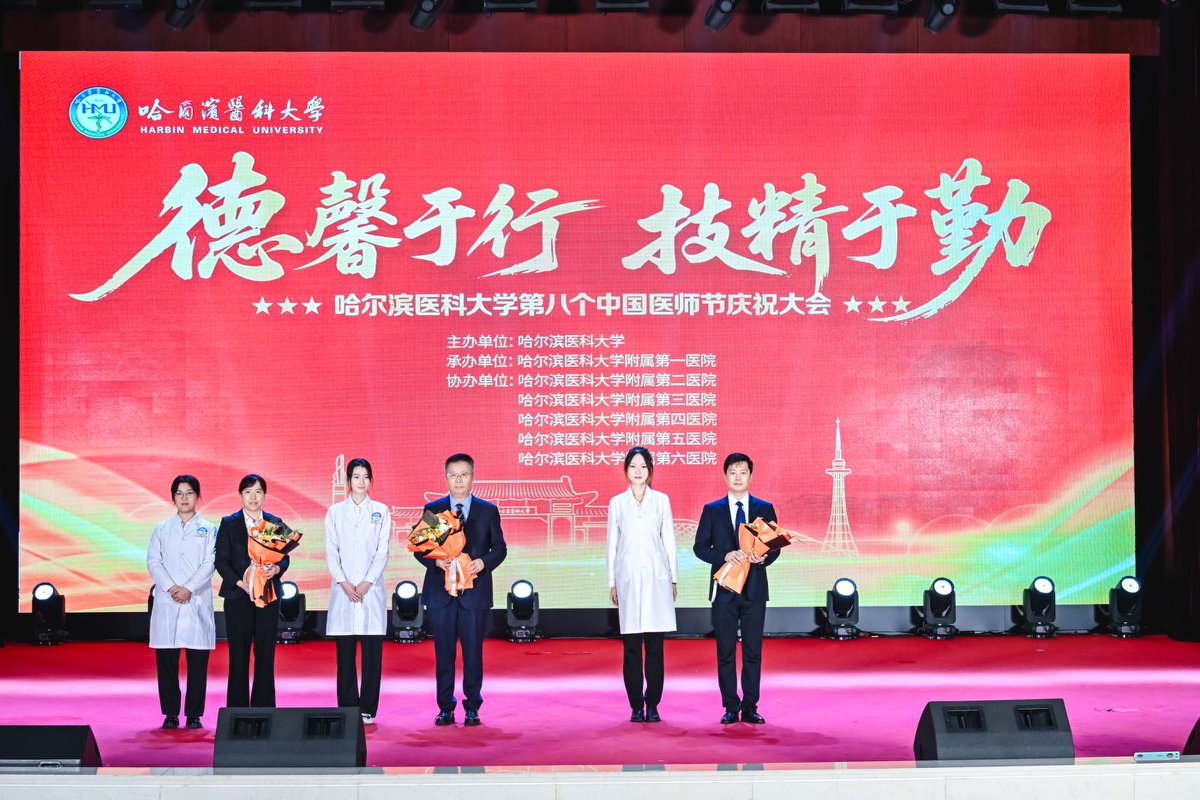 国家优秀青年医师获得者附属一院公永太、附属一院麻勇、附属二院韩艺、附属三院孟宏学,全国医务名匠获得者附属一院于凯江、全国卫生健康系统“白求恩奖章”获得者及国家杰出医师获得者附属二院于波、全国岗位学雷锋标兵获得者附属六院韩毅敏等接受学生代表献花并合影留念。