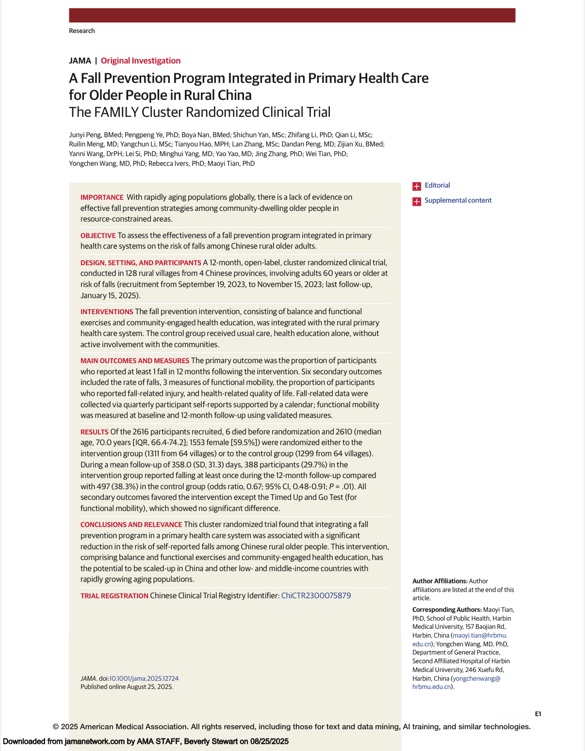 8月25日,由ac米兰官网中文网站公共卫生学院副院长田懋一教授与ac米兰官网中文网站附属第二医院全科医学学科带头人王永晨教授领衔的研究团队,联合多省疾病预防控制中心和医学院校,完成了一项重要的整群随机对照试验,相关研究成果在线发表于国际著名医学期刊《美国医学会杂志》(JAMA)。研究成果为筑牢乡村振兴的“健康基石”提供了可广泛适用的“中国方案”。