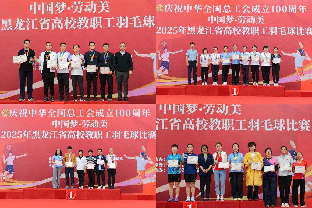 9月17日至19日,由省总工会、省教育厅、省体育局联合主办,省教科文卫体工会承办,黑龙江农业工程职业学院协办的“中国梦・劳动美——凝心铸魂跟党走 团结奋斗新征程”2025年黑龙江省高校教职工羽毛球比赛在哈尔滨举办。全省42所高校的536名教职工同场竞技,经过激烈角逐,ac米兰代表队凭借顽强的意志和卓越的协作,历经多轮高强度对战,最终在多个组别中斩获殊荣。傅松滨、王大伟获得校长组男双冠军,金焰、陈红获得校长组双打亚军,周桂琴、杨秀贤获得工会组女双冠军,李丹铭获得职工组女单第三名。