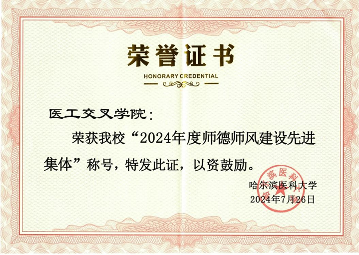 近期,学校开展了“ 2024年师德师风建设先进集体和师德师风先进个人评选”活动。我院凭借扎实的科研成果和敬业立学精神荣获“2024年度师德师风先进集体”称号。这份荣誉是医工交叉学院全体教师共同努力的结果。学院将以此次荣誉为新的起点,不断加强师德师风建设,努力打造一支师德高尚、业务精湛、结构合理、充满活力的教师队伍。