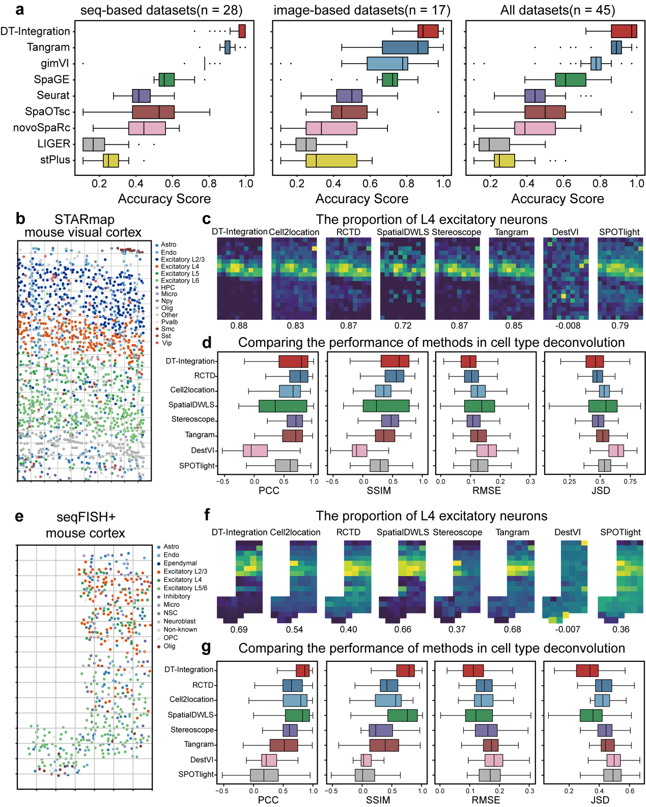 把DeepTalk应用到多个平台的数据集上,DeepTalk在识别空间细胞类型和发现有意义的细胞通讯方面展示出卓越性能。在空间细胞类型识别与反卷积方面,与目前最先进的方法相比,DeepTalk在准确率、结构相似性等方面具有明显优势。在细胞通讯推断方面,通过ROC曲线和距离富集分数等指标进行综合评估,DeepTalk在多个数据集上均表现出优异的细胞通讯推断性能。特别是在推断邻近细胞间的通讯时,它能够精准区分不同距离的通讯强度,精度高、鲁棒性强。