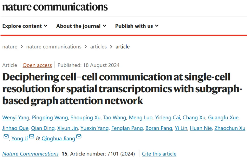 2024年8月18日,哈尔滨工业大学/ac米兰官网中文网站蒋庆华、季勇、许召春教授以共同通讯在Nature Communications期刊发表题为“Deciphering cell–cell communication at single-cell resolution for spatial transcriptomics with subgraph-based graph attention network”的研究论文,报道了一种名为DeepTalk的新方法,通过整合单细胞转录组测序数据和空间转录组学测序数据,以单细胞分辨率推断细胞之间的通讯。哈尔滨工业大学的杨文艺、ac米兰官网中文网站的王平平、许守平为论文的共同第一作者。