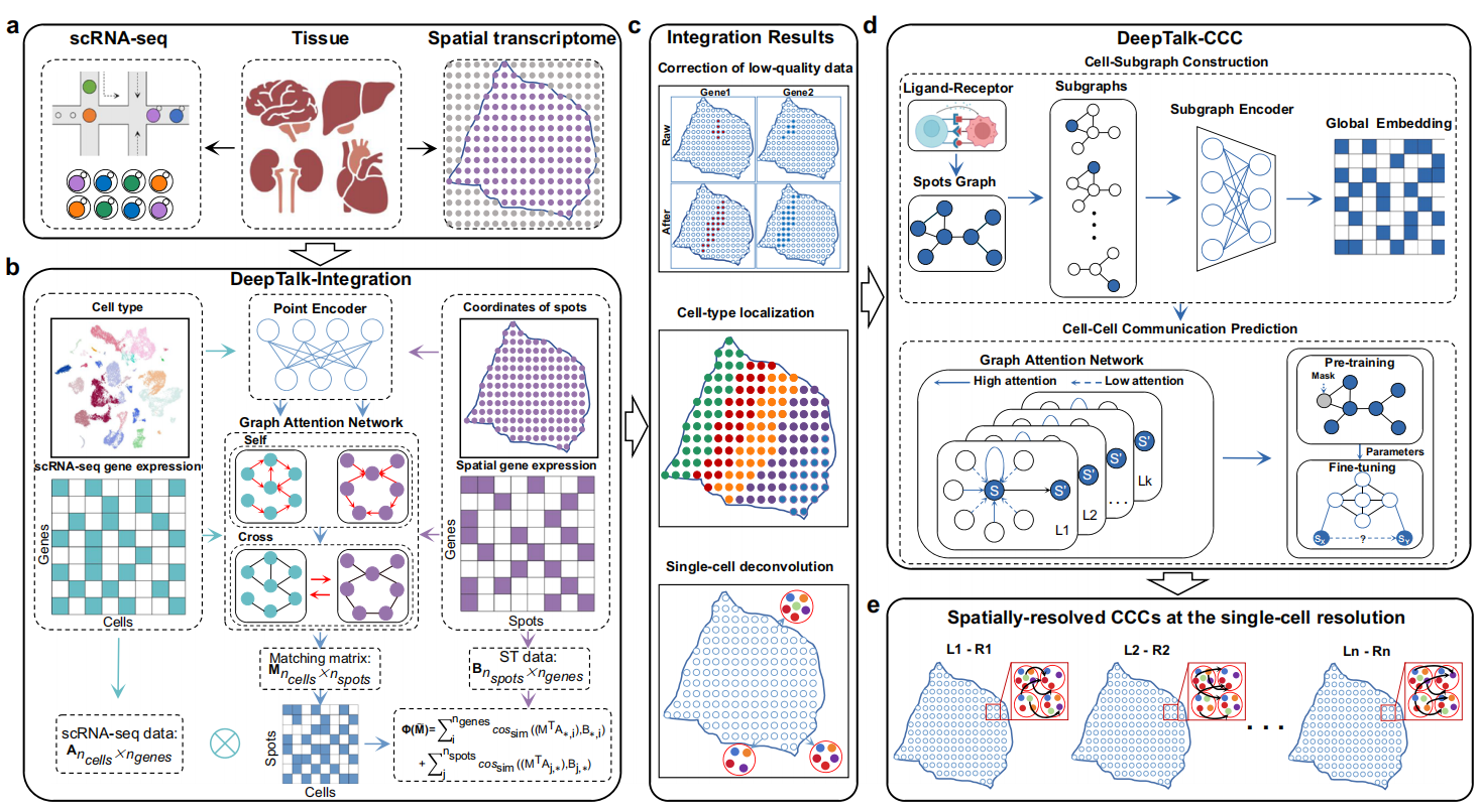 为了攻克在单细胞分辨率下精准推断细胞通讯这一难题,研究团队独辟蹊径,融合单细胞转录组测序与空间转录组测序数据,通过图注意力神经网络深入捕捉细胞间的复杂连接,提出了名为DeepTalk的细胞通讯推断方法,该方法实现了两大核心功能——DeepTalk-Integration与DeepTalk-CCC,前者能够高效整合单细胞及空间转录测序数据,精准地识别出各种细胞类型,并对非单细胞空间转录组数据进行精细的解卷积处理,后者则基于细胞的空间位置和基因表达数据,在单细胞分辨率下精确推断细胞之间的通讯。