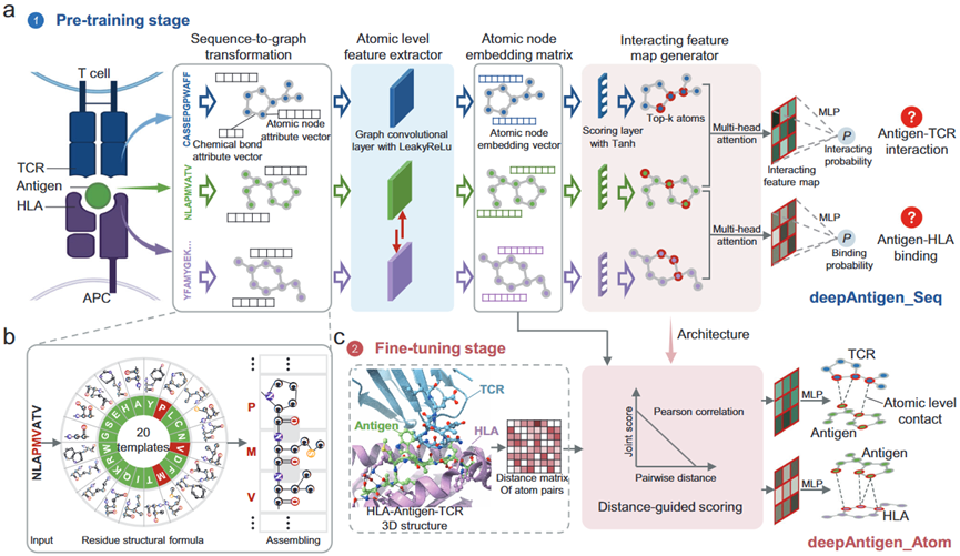 基于序列的抗原与HLA/TCR相互作用预测方法忽略了原子级特征,导致其在识别能够激活免疫反应的抗原方面表现不佳并且难以解释突变对于免疫响应的影响。为了克服这一难题,deepAntigen将抗原、HLA和TCR的氨基酸序列转换为以原子为节点,化学键为边的图,将原子水平特征作为输入,可以精准识别能够被HLA呈递并被TCR识别的抗原。该方法实现了两大核心功能——deepAntigen_Seq与deepAntigen_Atom,前者预测抗原与HLA/TCR是否相互作用,后者预测抗原与HLA/TCR之间关键的原子间接触。由于HLA-抗原-TCR复合物晶体结构数据有限,导致原子间接触信息不足,该研究采用了大规模预训练思想和少样本学习策略解决这一问题。首先利用丰富的序列水平相互作用数据对deepAntigen进行预训练,图卷积神经网络隐式地学习关键的原子特征,然后利用少量的原子水平接触信息进行微调,有效地从序列水平相互作用数据中整合原子间接触的先验信息,提高了关键的原子间接触预测的准确性。