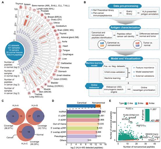 1.构建肿瘤-正常表位图谱:团队收集并重新分析了公开可用的免疫肽组学数据集,涵盖14种肿瘤和29种正常组织,在各类癌症和正常组织中检测到389,165条经典表位和70,270条非经典表位序列,并揭示非经典表位具有与经典表位相似的免疫特征。